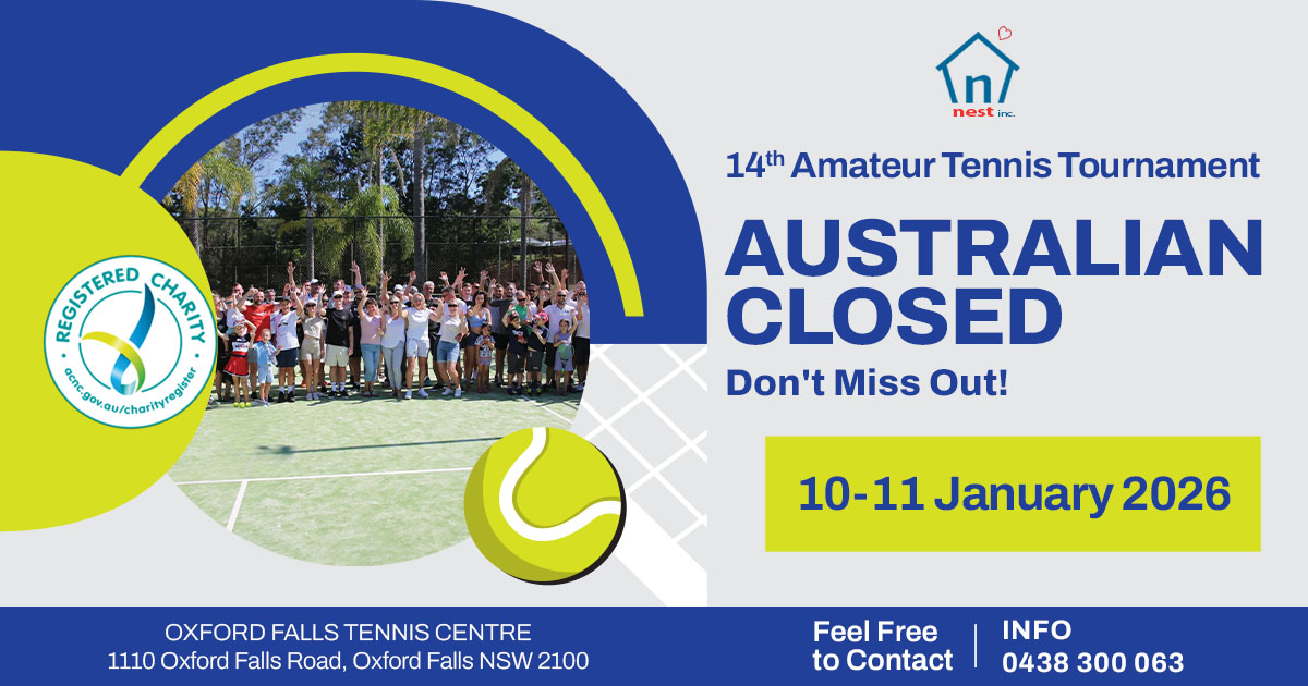 We’re hosting the Australian Closed Tennis Tournament taking place in January. All proceeds support Nest Incorporated’s humanitarian work, helping children and families in need.